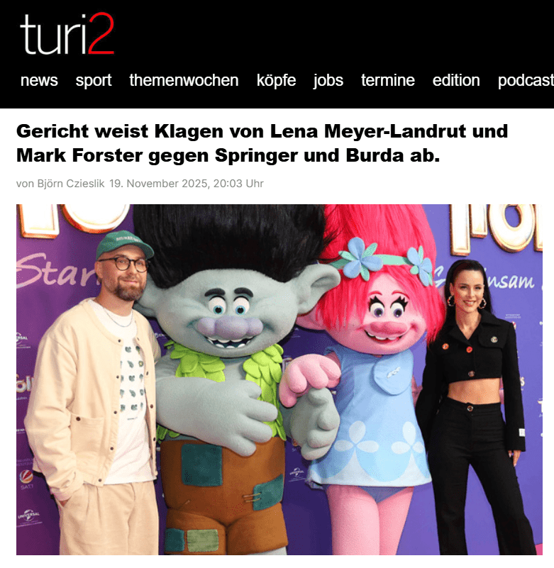 Sie wehren sich gegen Berichte über ihr Privatleben: Lena Meyer-Landrut und Mark … Prozess: Meyer-Landrut und Forster gegen Springer und Burda. uebermedien.de.