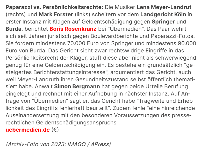 uebermedien. 18h. Sie wehren sich gegen Berichte über ihr Privatleben: Lena Meyer-Landrut und Mark … Prozess: Meyer-Landrut und Forster gegen Springer und Burda.
